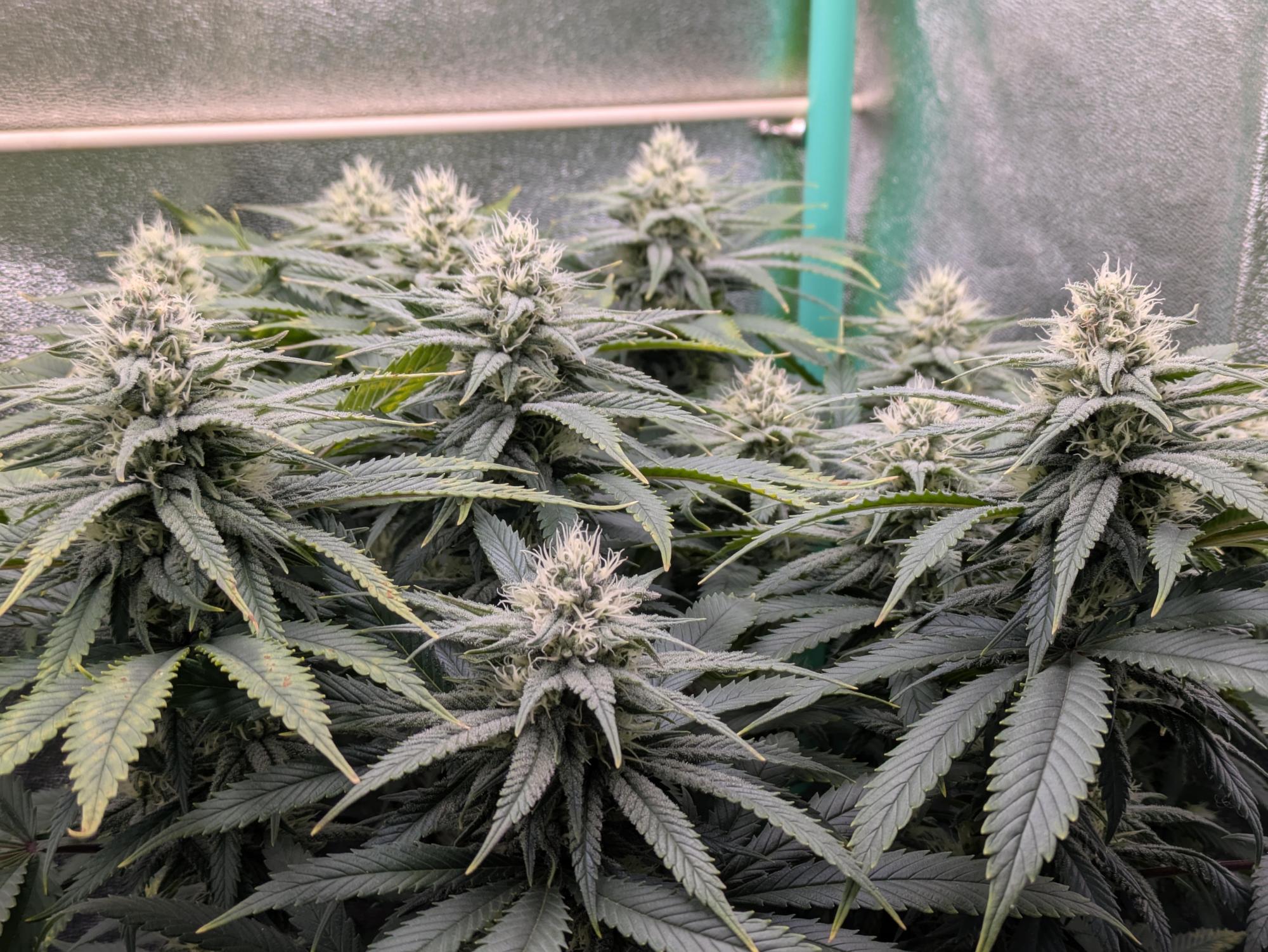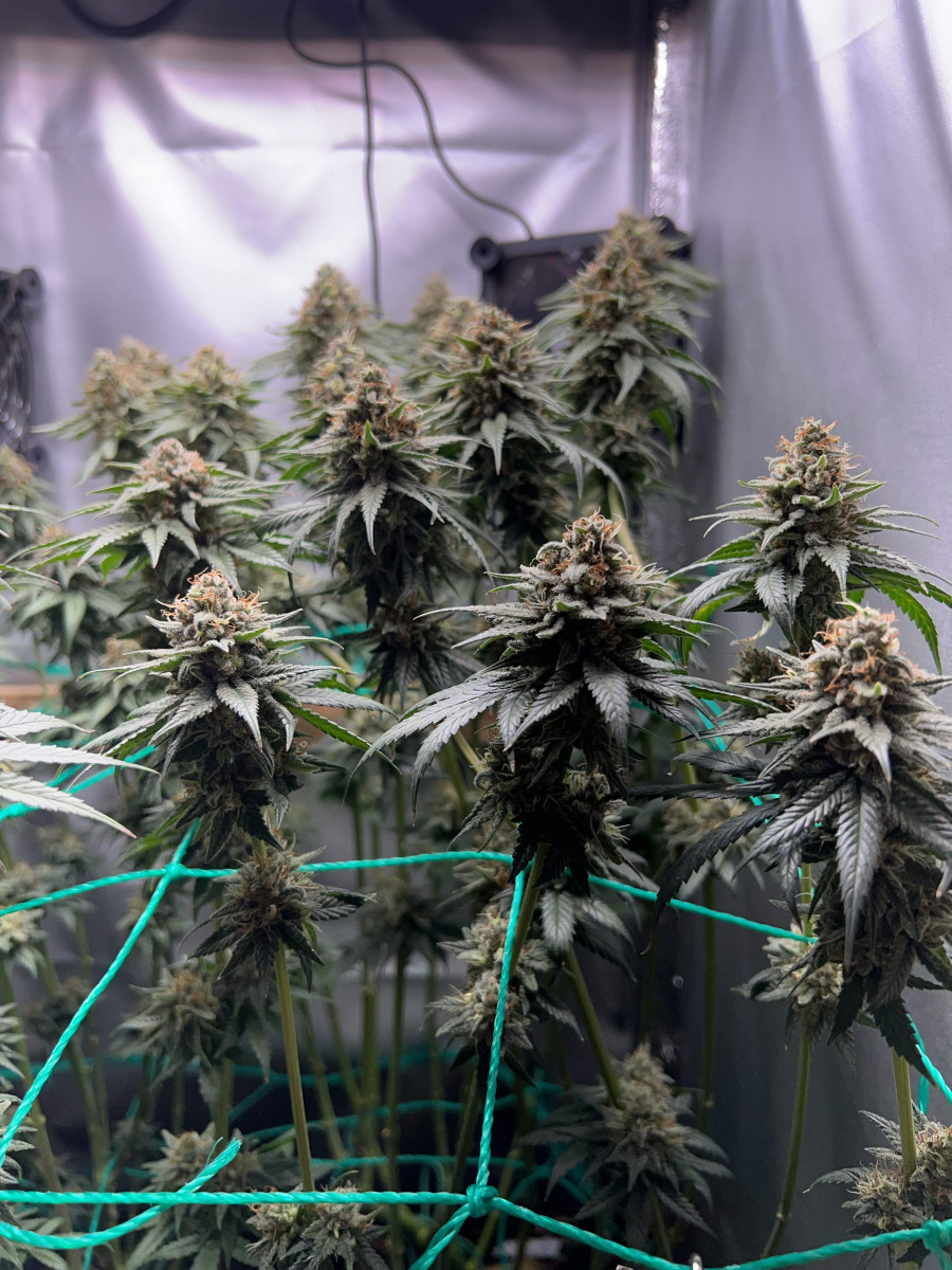 Все шло по плану, однако стебли девочки были немного тонкими по сравнению с огромным весом, который несли свежие цветущие бутоны, я привязал их все к опорам, потому что они действительно были очень тяжелыми, 750 грамм с растения – это действительно прекрасный урожай! В остальном у девочки действительно получились замечательные итоговые цвета, бутоны твердые как камень, не смолистые, как у других сестричек в палатке, но в целом я очень доволен!