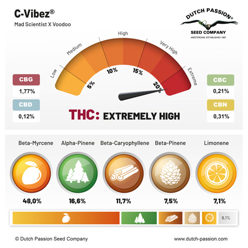 C-Vibez — быстроцветущий гибридный сорт, где доминирует сатива. Симпатичные кусты быстро доходят до кондиции, принося большой урожай плотных и ароматных шишек. Период цветения твердокаменных соцветий занимает около 10-12 недель. Время от времени встречаются фенотипы, которым бывает нужно на неделю-другую больше. Средняя высота составляет 1-1,5 м. Большинство этих высококачественных феминизированных семян превращается в итоге в крупные, зеленые растения. Примерно у 30% кустов зеленому цвету сопутствует другой цвет (в диапазоне от пурпурного до фиолетового). Сорт славится обильными урожаями и специфическим сочетанием терпенов.