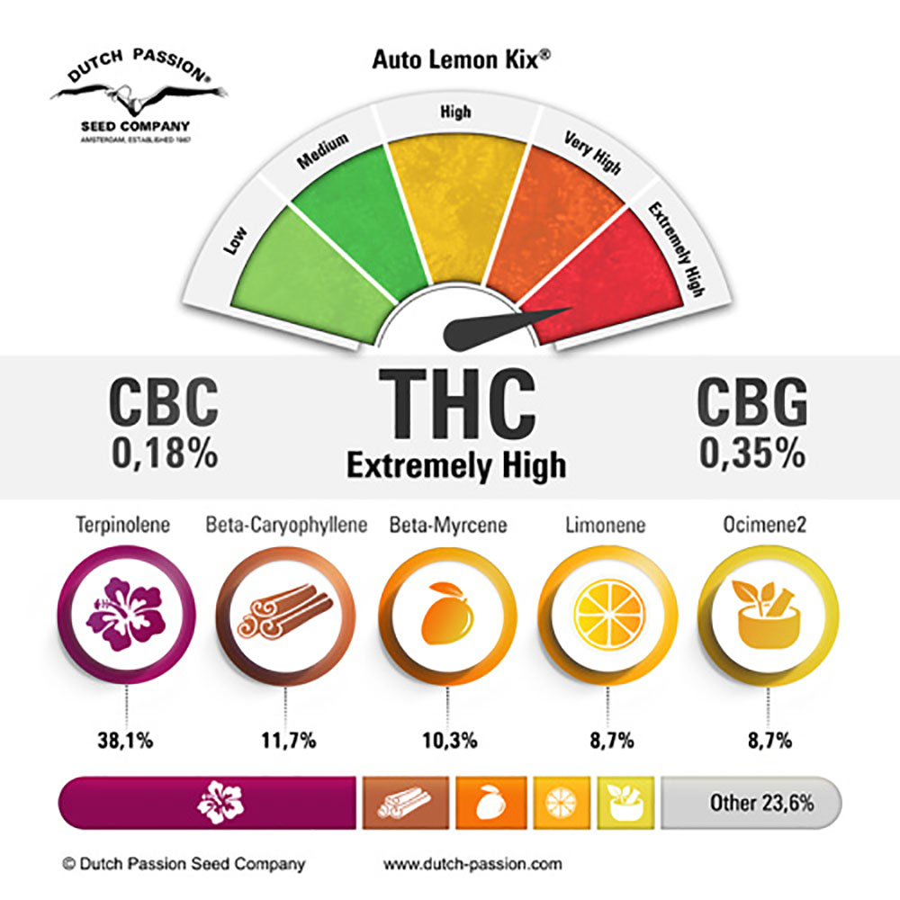 Чтобы вывести Auto Lemon Kix®, генетика хорошо известного американского сорта с запахом сладостей была гибридизирована при помощи сорта Las Vegas Lemon Skunk. Благодаря своим выдающимся родителям воздействие Auto Lemon Kix® остается очень мощным, а содержание ТГК — высоким. Урожайность высока, а из-за генетики сканка растения получаются неприхотливые, и их просто выращивать.