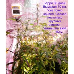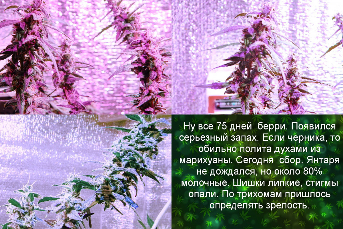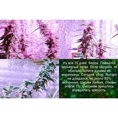 Бурный рост начинается вместе с предцветением на 3-4 неделе и продолжается до 7-8 недели, растяжка кажется чрезвычайной. Но растение сохраняло удивительно короткие междоузлия… затем волшебство начинается - цветы БЫСТРО набирают объем - ранний урожай из семян через 10 недель будет возможен, если основываться на наблюдении за трихомами. Дополнительные 2 недели терпения принесли красочную радость моим глазам, когда растение созрело, бутоны стали темно-фиолетовыми, тяжелыми, плотными и окруженными тяжелым сладким ароматом. Собран на 12 неделе от семян.... в награду я получил 290 г сухого веса шишек.