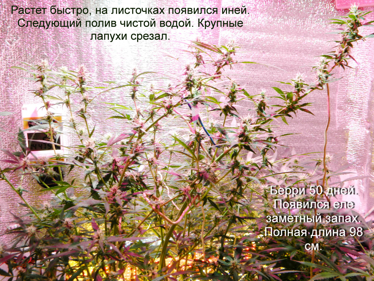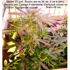 Крепенький стойкий сорт. Сперва кустик опробовал в индоре, не издевался, на прочность не испытывал, но и проблем никаких не возникло. Следующие решил гровить уже в аутдоре. Потому что индор весьма скромен по урожайности на кустик. Другое дело аутдор, где растения могут свободно вытянуться до 120 см и подарить немногим меньше 150 грамм. Хотя охотно верю, что есть условия в ауте будут как в Калифорнии, то и все 200 грамм получится снять.