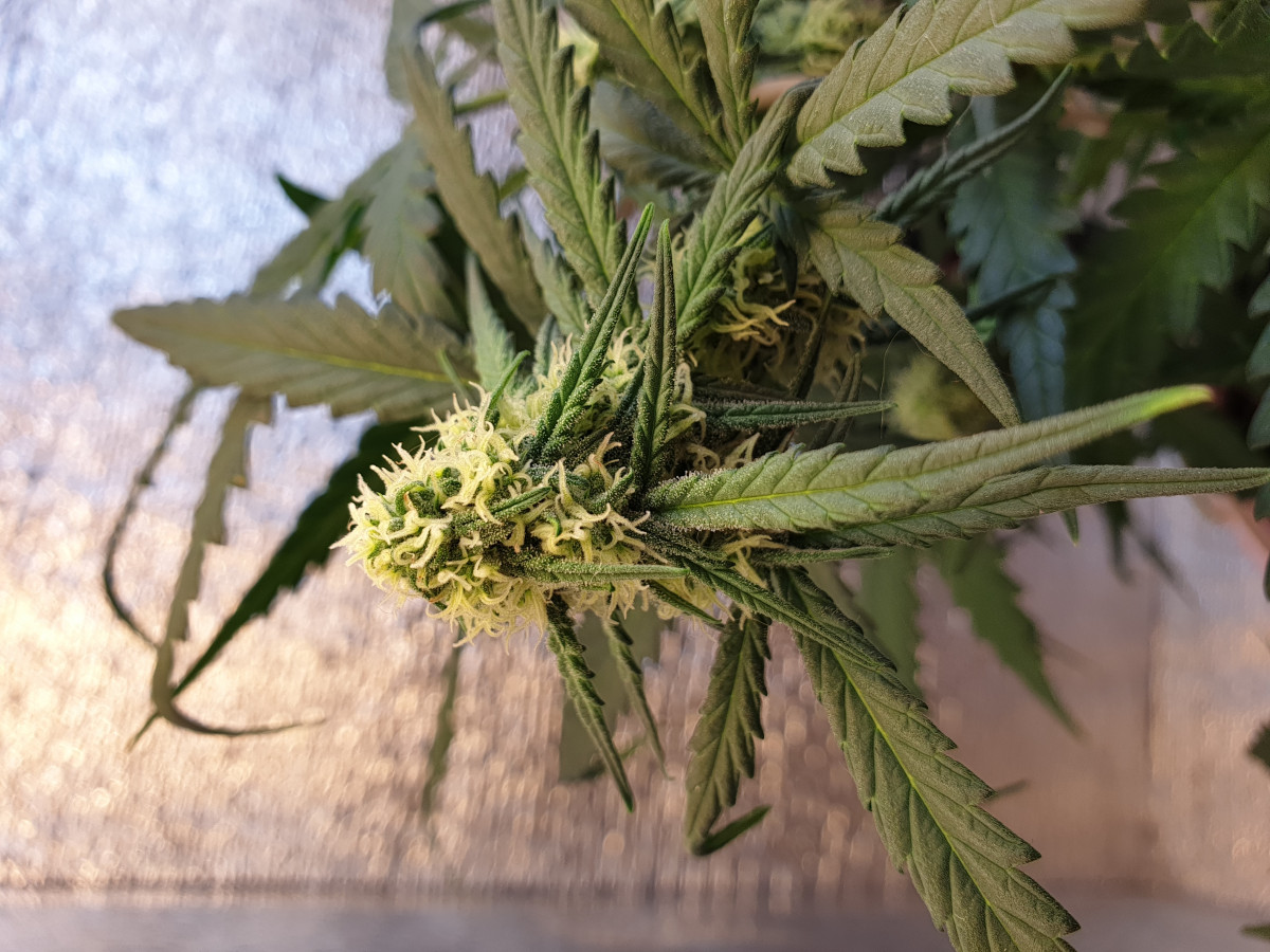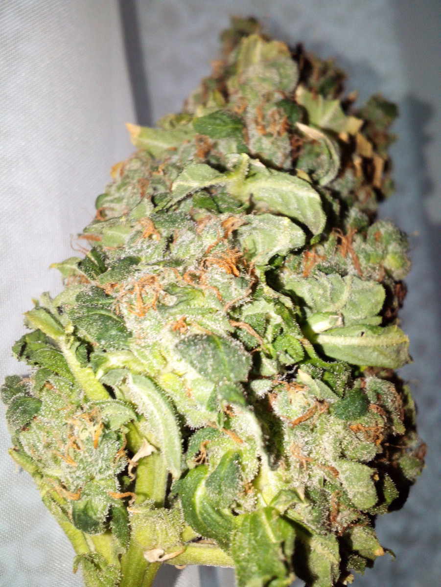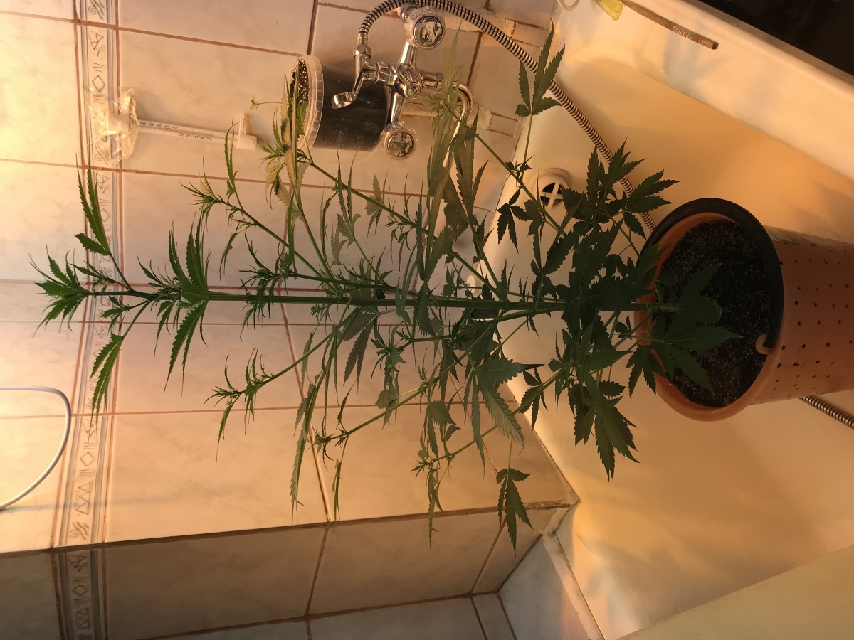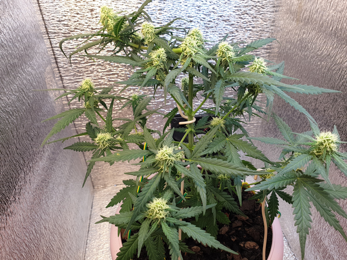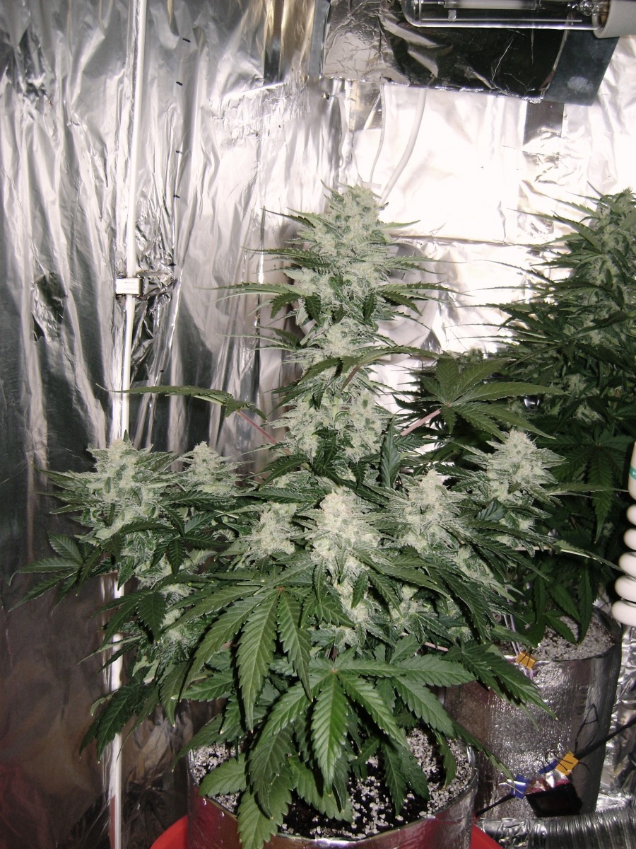 Первый гроу, много ошибок. Однако, несмотря на дичайшие условия в боксе, 40*40*80: 3 разных сорта в микробоксе, температура от 18 до 33, 120 Вт света, влажность 20% весь гроу, постоянная обрезка листьев из-за нехватки места, эта малышка выросла и дала 15 грамм шишек за 12 недель. Ароматные, вкусные и КРАЙНЕ ПСИХОАКТИВНЫЕ. Серьезно, пробуйте аккуратно, это вам не сухая, которую найдешь в снегу, это атомная бомба. У одной дамы крышняк протек на пару часов от маленького. Да и мне с моим толером дало по шарам. Рекомендую.