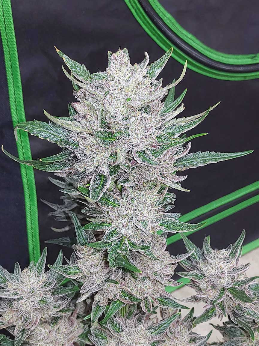 Этот сорт может давать до 550 г/м2 урожая за 9-10 недель и развивает основную колу, которая достигает 120 см и окружена длинными боковыми ветвями, которые растут близко друг к другу и, несмотря на его высоту, придают ему компактный вид. Благодаря хорошо сбалансированной генетике этот сорт развивает густую листву, которая может в самом начале роста приобрести пурпурный оттенок, и супер морозные и плотные бутоны размером с мяч для пинг-понг. Это идеальный выбор для экстракторов, ищущих первоклассные сорта с нетрадиционным, но крайне привлекательным терпеновым профилем и большим количеством высококачественной смолы.