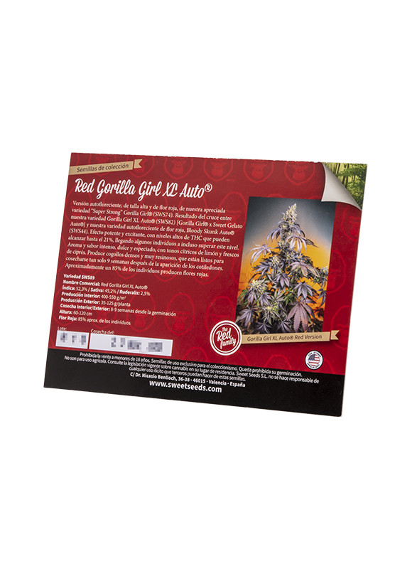 Очень высокая, автоцветущая версия с красными цветками нашего заветного «суперсильного» сорта Gorilla Girl® (SWS74). Результат скрещивания нашей Gorilla Girl XL Auto® (SWS82) [Gorilla Girl® x Sweet Gelato Auto®] и нашего автоцветущего сорта, известного своими пурпурными цветами, Bloody Skunk Auto® (SWS44).