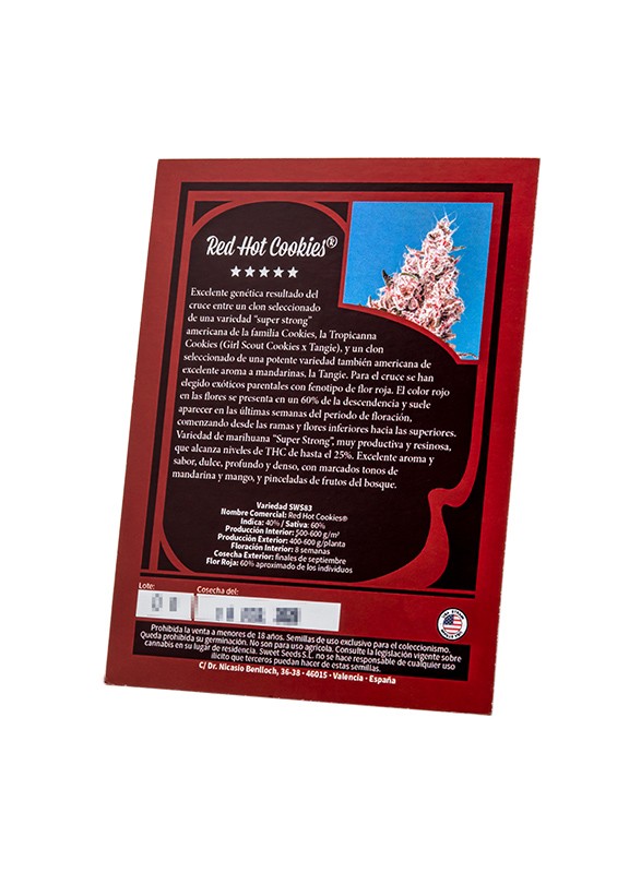 Red Hot Cookies® (SWS83) - это «суперсильный», высокопродуктивный и смолистый сорт с высоким уровнем ТГК до 25%. Обладает прекрасным ароматом и вкусом; он сладкий, глубокий и плотный, с выраженными тонами мандарина и манго, плюс оттенки лесных фруктов.