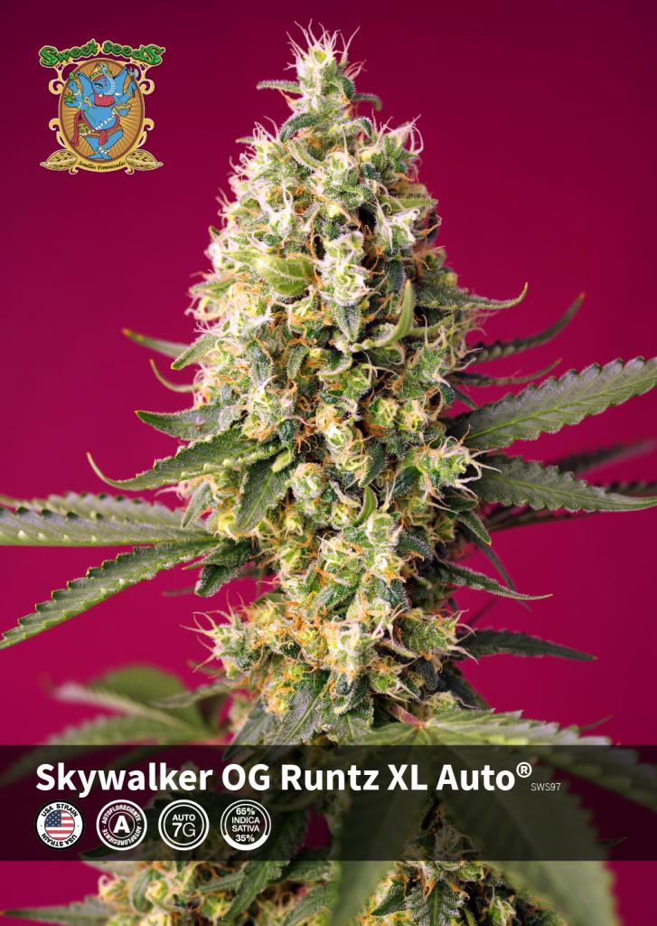 Автоцветущий сорт 7-го поколения.Это наша автоцветущая версия Skywalker OG (OG Kush x Skywalker), которая в основном состоит из индики, дает высокие урожаи и является фаворитом на Западном побережье США. Мы включили гены автоцвета одного из наших собственных штаммов, Runtz XL Auto® [Runtz (Zkittlez x Gelato) x Sweet Gelato Auto®].
