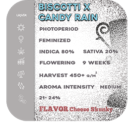 Biscotti — это десертный сорт от известного бридера Джигги (Jai Chang) и компании Cookies Fam. Он завоевал популярность благодаря своему бисквитному аромату, плотным шишкам и сильному эффекту.