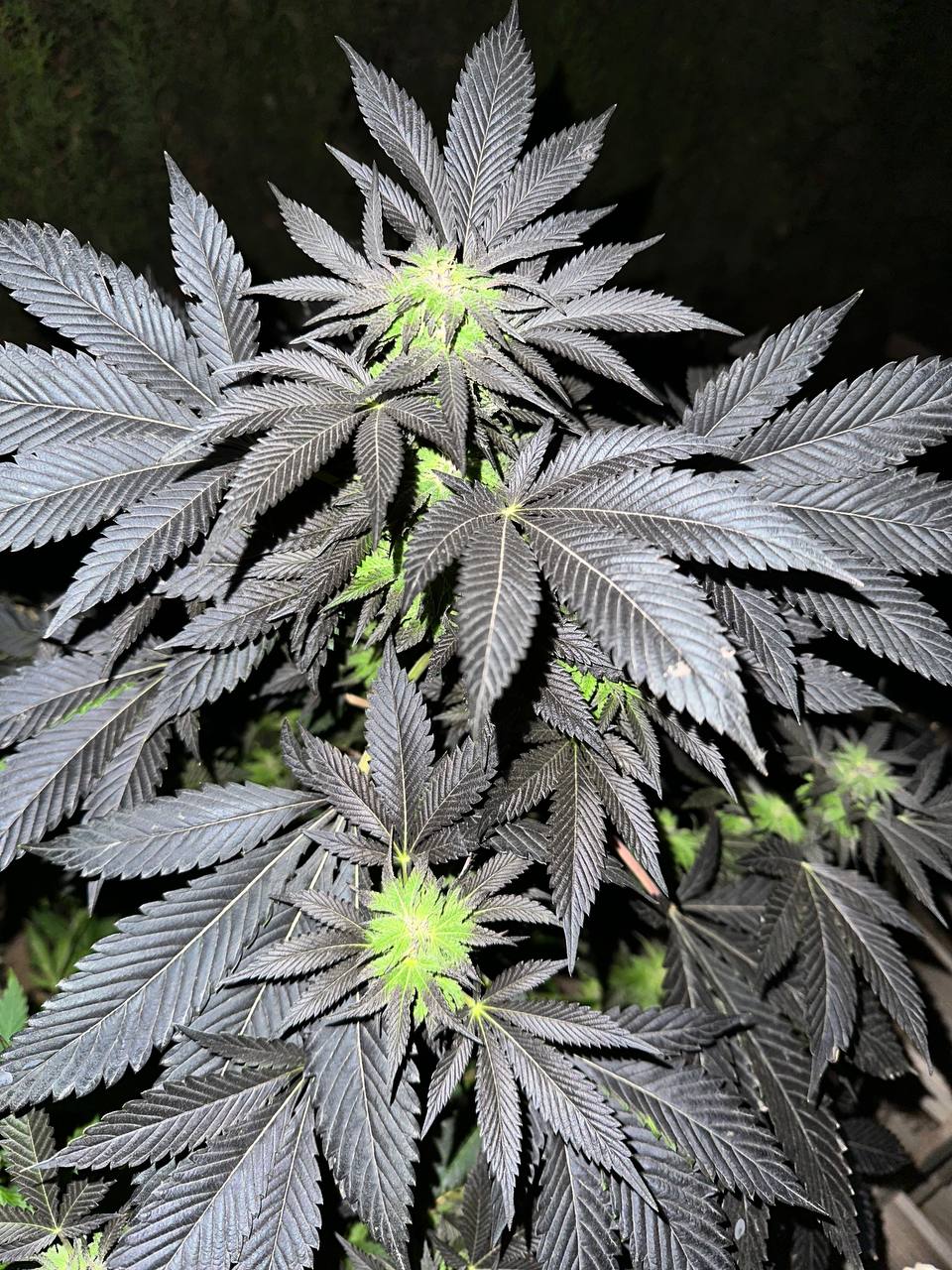 Шишки часто окрашиваются в пурпурный оттенок, а при низких температурах листья могут стать почти чёрными. Смолистость этого сорта заметна сразу — густые белые трихомы красиво контрастируют с тёмными шишками.